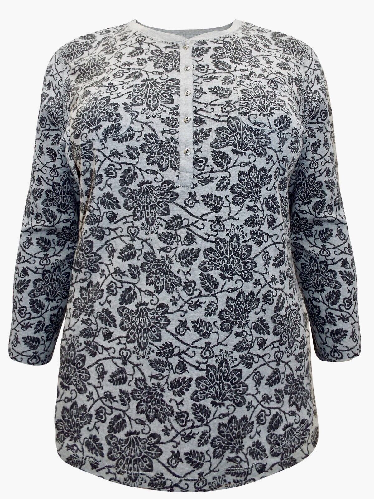 A gorgeous grey floral top featuring a classic Henley neckline and two breast pockets