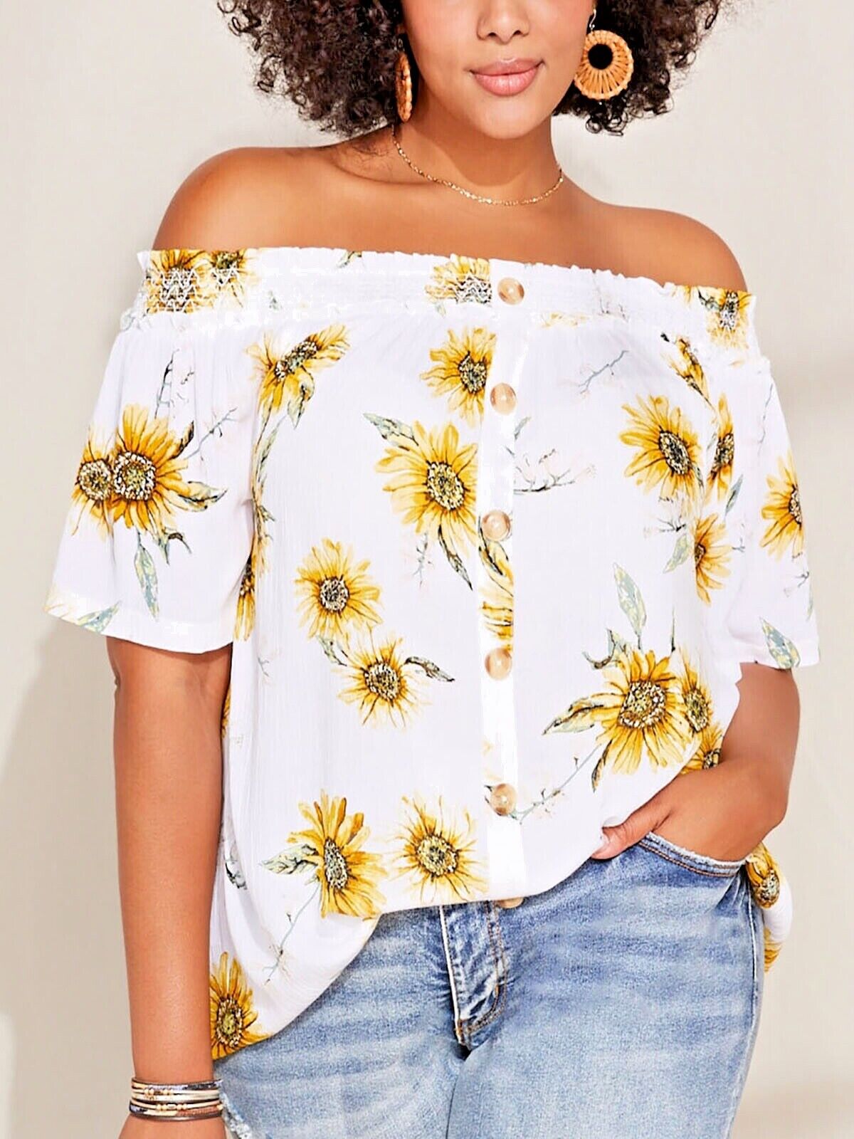 Womens Sunflower Blouse Plus Size 18/20 22/24 26/28 28/30 Bardot Crinkle Top 747